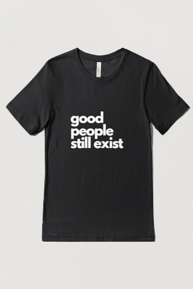 This high-quality, 100% cotton T-shirt featuring the GPSE logo design is available in various sizes. It promotes the message of positivity and kindness, encouraging the belief that good people still exist.